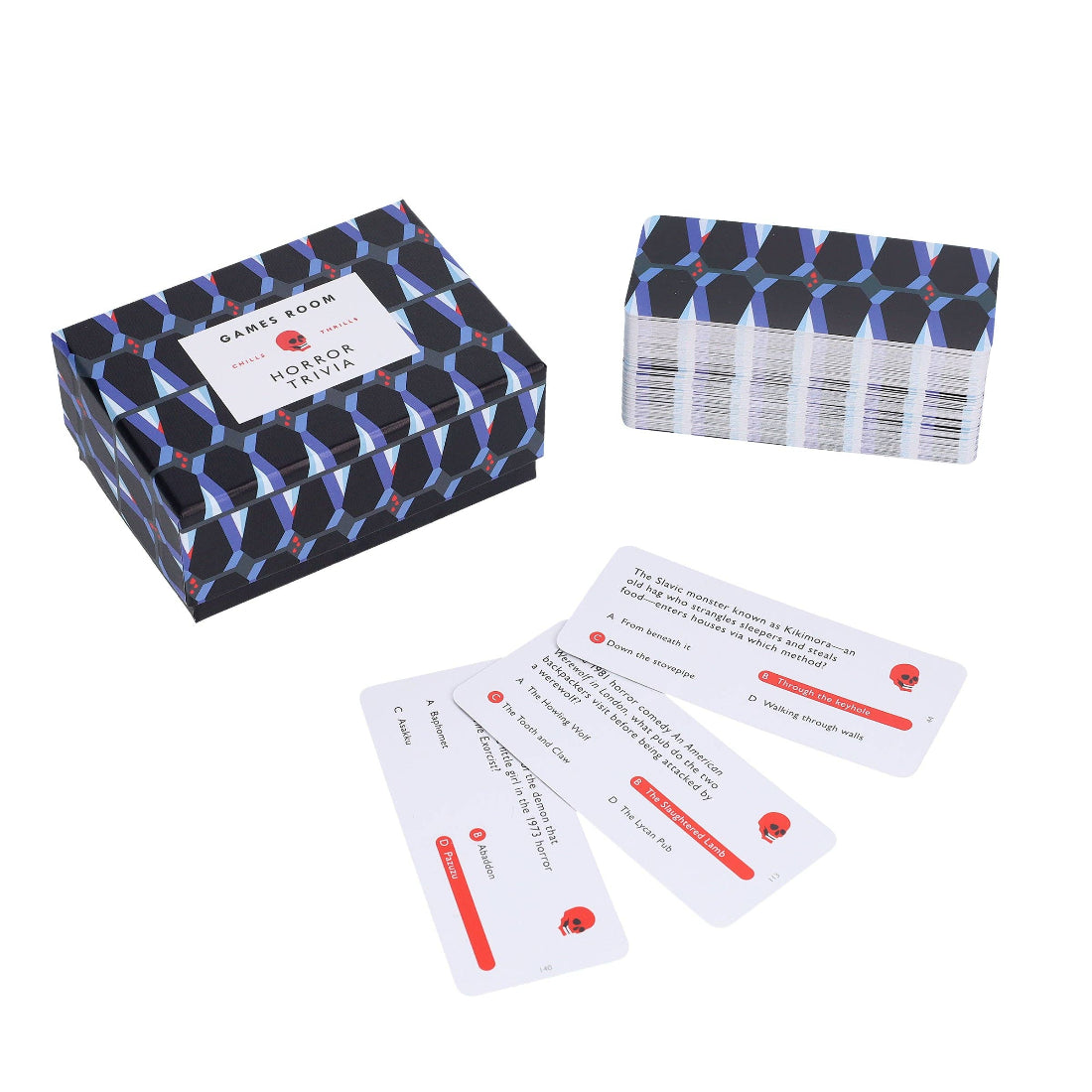An eye-catching portable box holds 140 multiple-choice questions on a range of spine-tingling topics drawn from horror movies, literature, TV shows, haunted places, paranormal phenomena, famous monsters, and more.